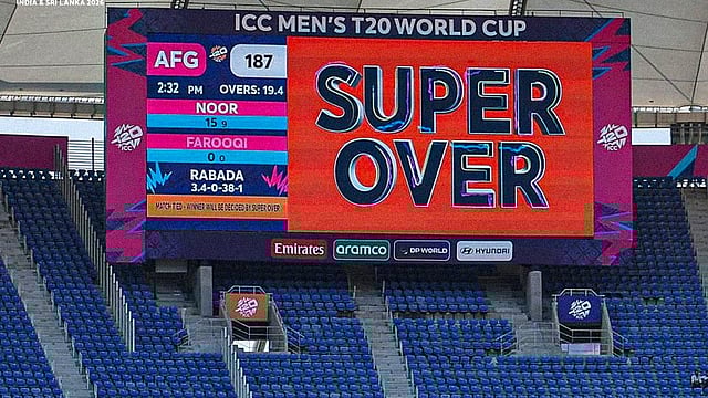 ಆಫ್ರಿಕಾದ ಲುಂಗಿ ಎನ್ಗಿಡಿ ಎಸೆದ ಸೂಪರ್ ಓವರ್ ನಲ್ಲಿ ಆಫ್ಘಾನಿಸ್ತಾನ ಒಂದು ಸಿಕ್ಸರ್, ಒಂದು ಬೌಂಡರಿ ಸಹಿತ 17 ರನ್ ಕಲೆಹಾಕಿತು. ಇದನ್ನು ಬೆನ್ನು ಹತ್ತಿದ ದಕ್ಷಿಣ ಆಫ್ರಿಕಾ ಕೂಡ ಒಂದು ಬೌಂಡರಿ ಮತ್ತು ಒಂದು ಸಿಕ್ಸರ್ ಸಹಿತ 17 ರನ್ ಗಳನ್ನು ಕಲೆಹಾಕಿತು. ಆಫ್ಘಾನಿಸ್ತಾನದ ಫರೂಕಿ ಎಸೆದ ಸೂಪರ್ ಓವರ್ ನಲ್ಲಿ ದಕ್ಷಿಣ ಆಫ್ರಿಕಾ 5 ಎಸೆತದಲ್ಲಿ 1 ವಿಕೆಟ್ ಕಳೆದುಕೊಂಡು 11 ರನ್ ಕಲೆಹಾಕಿತ್ತು.