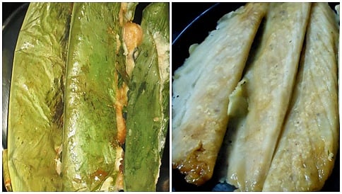 ಹೀಗೆ ಮಡಚಿದ ಎಲೆಗಳನ್ನು ಇಡ್ಲಿ ಪಾತ್ರೆಯಲ್ಲಿಟ್ಟು ಹಬೆಯಲ್ಲಿ ಬೇಯಿಸಿ ತಣ್ಣಗಾದ ಮೇಲೆ (ತುಪ್ಪ ಸೇರಿಸಿ) ಸವಿಯಬಹುದು.