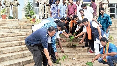 ಗೋಮೂತ್ರ ಸಿಂಪಡಿಸುತ್ತಿರುವ ಬಿಜೆಪಿ ಕಾರ್ಯಕರ್ತರು
