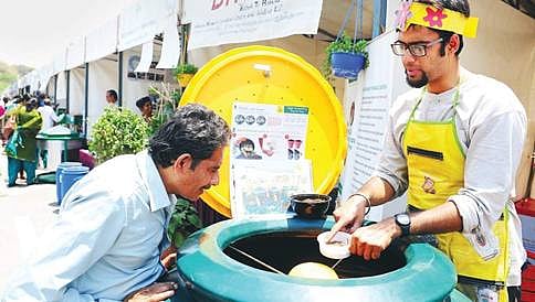 ವಿಧಾನ ಸೌಧದ ಹೊರಗೆ ನಿನ್ನೆ ನಡೆದ ತ್ಯಾಜ್ಯಗಳಿಂದ ಗೊಬ್ಬರ ತಯಾರಿಸುವ ವಿಧಾನವನ್ನು ವ್ಯಕ್ತಿಯೊಬ್ಬರು ಪರಿಶೀಲಿಸುತ್ತಿರುವುದು.