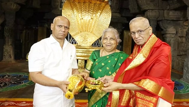 ತಿರುಪತಿ: ಇನ್ಫೋಸಿಸ್ ಸಂಸ್ಥೆ ಸಹ ಸಂಸ್ಥಾಪಕ ಎನ್.ಆರ್. ನಾರಾಯಣಮೂರ್ತಿ ಹಾಗೂ ಸುಧಾ ಮೂರ್ತಿ ದಂಪತಿ ತಿರುಪತಿ ವೆಂಕಟೇಶ್ವರಸ್ವಾಮಿಗೆ ಬಂಗಾರದ ಶಂಖ ಹಾಗೂ ಆಮೆ ವಿಗ್ರಹ ಕಾಣಿಕೆಯಾಗಿ ನೀಡಿದ್ದಾರೆ.