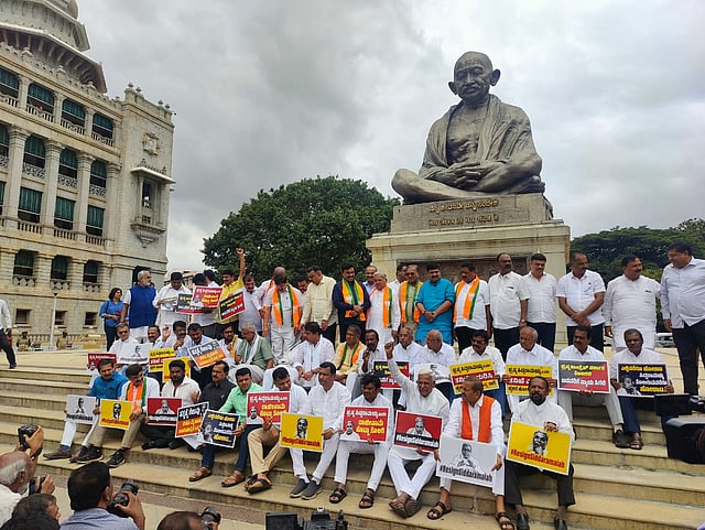 ವಿಧಾನಸೌಧದ ಮಹಾತ್ಮಗಾಂಧಿ ಪ್ರತಿಮೆ ಎದುರು ವಿಧಾನಸಭೆ ಮತ್ತು ಪರಿಷತ್ತಿನ ಪ್ರತಿಪಕ್ಷದ ನಾಯಕರಾದ ಆರ್.ಅಶೋಕ ಮತ್ತು ಛಲವಾದಿ ನಾರಾಯಣಸ್ವಾಮಿ ನೇತೃತ್ವದಲ್ಲಿ ನಡೆದ ಪ್ರತಿಭಟನೆಯಲ್ಲಿ ಪಕ್ಷದ ಶಾಸಕರು ಹಾಗೂ ಮುಖಂಡರು ಘೋಷಣಾ ಫಲಕಗಳನ್ನು ಹಿಡಿದು ಘೋಷಣೆಗಳನ್ನು ಕೂಗಿದರು.