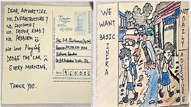ಮಹಾದೇವಪುರ ವಿಧಾನಸಭಾ ಕ್ಷೇತ್ರದ ಕಾರ್ಮೆಲಾರಾಮ್, ಗುಂಜೂರ್ಪಾಳ್ಯ ಮತ್ತು ಚಿಕ್ಕಬೆಳ್ಳಂದೂರಿನ ಕೆಲವು ಮಕ್ಕಳು ರಸ್ತೆ ಗುಂಡಿ ಹಾಗೂ ಸಂಚಾರ ದಟ್ಟಣೆ ಸಮಸ್ಯೆ ಪರಿಹರುವಂತೆ ಪತ್ರ ಅಭಿಯಾನವನ್ನು ಆರಂಭಿಸಿದ್ದಾರೆ.