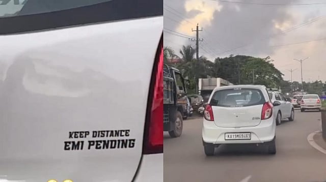 ಸಾಮಾನ್ಯವಾಗಿ ವಾಹನಗಳಲ್ಲಿ ಅಂತರ ಕಾಯ್ದುಕೊಳ್ಳಿ ಎಂಬ ಬರಹ ಸಾಮಾನ್ಯ, ಆದರೆ ಈ ಕಾರಿನಲ್ಲಿ ಗಮನಸೆಳೆಯುವ ಸಾಲುಗಳಿವೆ. "ಅಂತರ ಕಾಯ್ದುಕೊಳ್ಳಿ, EMI ಬಾಕಿ ಇದೆ" ಎಂದು ಬರೆಯಲಾಗಿದೆ. ಈ ಸಂದೇಶವು ಸಾಮಾನ್ಯ ರಸ್ತೆ-ಸುರಕ್ಷತಾ ಎಚ್ಚರಿಕೆಗೆ ಹಾಸ್ಯಮಯ ಸ್ಪರ್ಶ ನೀಡಿದೆ. ಈ ಕಾರಿನ ಮಾಲಿಕ ಗಂಭೀರ ವಿಷಯವನ್ನು ಹಾಸ್ಯಮಯ ರೀತಿಯಲ್ಲಿ ಜನರಿಗೆ ತಲುಪಿಸಿದ್ದಾರೆ.
