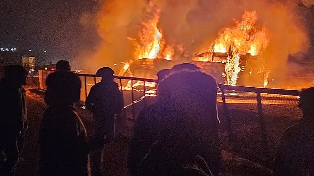 ಡಿಕ್ಕಿ ಬಳಿಕ ಕಂಟೇನರ್ ಲಾರಿ ಹಾಗೂ ಬಸ್ ಎರಡೂ ಬೆಂಕಿ ಹೊತ್ತಿಕೊಂಡಿದ್ದು, ಬಸ್ ಸಂಪೂರ್ಣವಾಗಿ ಸುಟ್ಟುಕರಕಲಾಗಿದೆ.