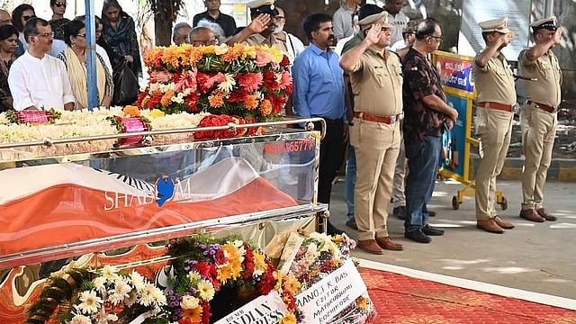 ಇದಕ್ಕೂ ಮುನ್ನ ಪೊಲೀಸ್ ಬ್ಯಾಂಡ್ ಮೂಲಕ ರಾಷ್ಟ್ರಗೀತೆ ನುಡಿಸಿ ಪೊಲೀ ಸರಿಂದ ಗಾಳಿಯಲ್ಲಿ ಮೂರು ಸುತ್ತು ಗುಂಡು ಹಾರಿಸುವ ಮೂಲಕ ಮೃತರಿಗೆ ಸರ್ಕಾರಿ ಗೌರವ ಸಲ್ಲಿಸಲಾಯಿತು. ಬಳಿಕ ಅಧಿಕಾರಿಗಳು ಮೃತದೇಹದ ಮೇಲೆ ಹೊದಿಸಿದ್ದ ರಾಷ್ಟ್ರಧ್ವಜ ವನ್ನು ಕುಟುಂಬಸ್ಥರಿಗೆ ಹಸ್ತಾಂತರಿಸಿದರು.