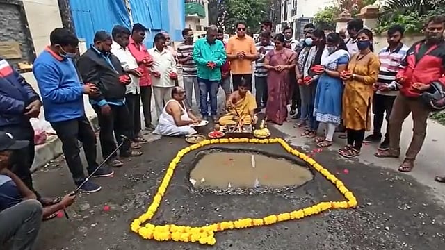 ಹೌದು.. ಬೆಂಗಳೂರಿನಲ್ಲಿ ಹೆಚ್ಚುತ್ತಿರುವ ರಸ್ತೆ ಗುಂಡಿಗಳಿಂದ ಬೇಸತ್ತ ಬೆಂಗಳೂರಿನ ನಾಗರಿಕರ ಗುಂಪೊಂದು ಶನಿವಾರ (ಸೆಪ್ಟೆಂಬರ್ 27, 2025) ವಿನೂತನ ರೀತಿಯಲ್ಲಿ ಪ್ರತಿಭಟನೆ ನಡೆಸಿದ್ದಾರೆ. ರಸ್ತೆ ಗುಂಡಿಗಳು ಯಾವುದೇ ಜೀವವನ್ನು ಬಲಿ ತೆಗೆದುಕೊಳ್ಳದಂತೆ ಅವುಗಳಿಗೆ ಪ್ರಾರ್ಥಿಸಿ ಪೂಜೆ ಸಲ್ಲಿಸಿದ್ದಾರೆ.