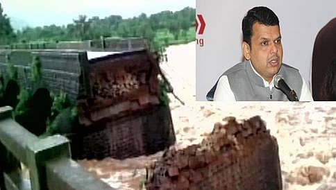 ಮಳೆಯ ಪ್ರವಾಹಕ್ಕೆ ಕುಸಿದು ಹೋಗಿರುವ ಸೇತುವೆ, ಒಳ ಚಿತ್ರದಲ್ಲಿ ಮಹಾರಾಷ್ಟ್ರ ಮುಖ್ಯಮಂತ್ರಿ ದೇವೇಂದ್ರ ಫಡ್ನವಿಸ್