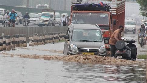 ದೆಹಲಿ-ಗುರುಂಗಾವ್ ರಸ್ತೆಯಲ್ಲಿ ಭಾರೀ ಮಳೆಯಿಂದ ರಸ್ತೆ ತುಂಬ ನೀರು ಉಕ್ಕಿ ವಾಹನ ಸಂಚಾರರು ಪ್ರಯಾಸ ಪಡುತ್ತಿರುವುದು.