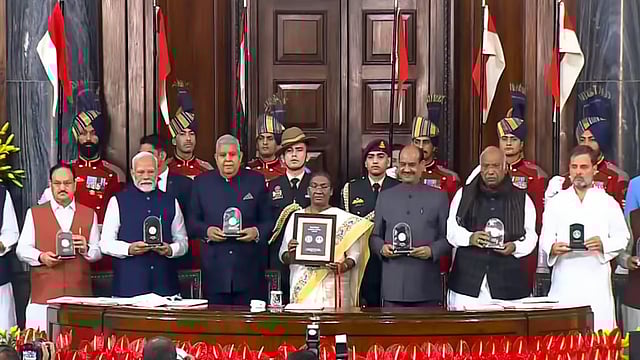 ಕಾರ್ಯಕ್ರದಲ್ಲಿ ರಾಷ್ಟ್ರಪತಿ ದ್ರೌಪದಿ ಮುರ್ಮು, ಲೋಕಸಭೆ ಸ್ಪೀಕರ್ ಓಂ ಬಿರ್ಲಾ, ಪ್ರಧಾನಿ ನರೇಂದ್ರ ಮೋದಿ, ವಿಪಕ್ಷ ನಾಯಕ ರಾಹುಲ್ ಗಾಂಧಿ, ಎಐಸಿಸಿ ಅಧ್ಯಕ್ಷ ಮಲ್ಲಿಕಾರ್ಜುನ ಖರ್ಗೆ ಸೇರಿದಂತೆ ಸಂಸತ್ ಸದಸ್ಯರೆಲ್ಲರೂ ಲೋಕಸಭೆಯಲ್ಲಿ ಹಾಜರಿದ್ದರು.