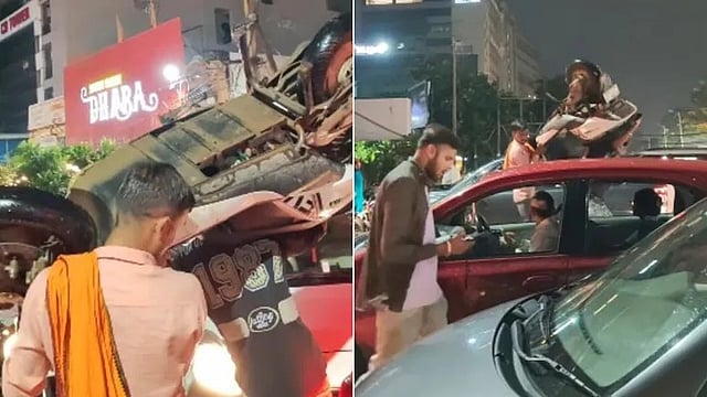 ಇಬ್ಬರು ವ್ಯಕ್ತಿಗಳು ಸ್ಕೂಟರ್ ನ್ನು ಈ ರೀತಿ ಎತ್ತಿಕೊಂಡು ಹೋಗುವ ದೃಶ್ಯ ನೋಡಿ ಅಲ್ಲಿದ್ದವರು ನಿಬ್ಬೆರಗಿನಿಂದ ನೋಡುತ್ತಿದ್ದರು.
