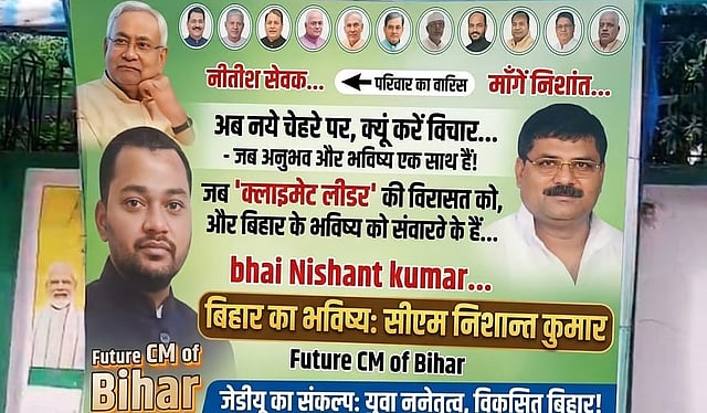 ಪಾಟ್ನಾ: ಬಿಹಾರದ ಮುಂದಿನ ಮುಖ್ಯಮಂತ್ರಿ ಹುದ್ದೆಗೆ ಸಂಭಾವ್ಯ ಅಭ್ಯರ್ಥಿಗಳಾಗಿ ಹಲವಾರು ಬಿಜೆಪಿ ನಾಯಕರ ಹೆಸರುಗಳು ಕೇಳಿಬರುತ್ತಿರುವುದರದ ನಡುವೆ ಶನಿವಾರ ಪಾಟ್ನಾದ ಜೆಡಿ(ಯು) ಕಚೇರಿ ಬಳಿ ಮುಖ್ಯಮಂತ್ರಿ ನಿತೀಶ್ ಕುಮಾರ್ ಅವರ ಪುತ್ರ ನಿಶಾಂತ್ ಕುಮಾರ್ ಅವರೇ ಮುಂದಿನ ಸಿಎಂ ಎಂದು ಬಿಂಬಿಸುವ ಪೋಸ್ಟರ್ಗಳು ಕಾಣಿಸಿಕೊಂಡಿವೆ.