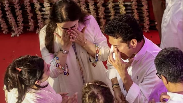 ಮುಂಬೈನ ಲೋವರ್ ಪರೇಲ್ನ ಗ್ರಾಂಡೆಯಲ್ಲಿರುವ ಆಶಾ ಭೋಂಸ್ಲೆ ಅವರ ನಿವಾಸದಲ್ಲಿ ಸೋಮವಾರ ಪಾರ್ಥಿವ ಶರೀರದ ಅಂತಿಮ ದರ್ಶನ ಪಡೆದ ನಂತರ ಸಚಿನ್ ತೆಂಡೊಲ್ಕರ್ ಹಾಗೂ ಅವರ ಪತ್ನಿ ಅಂಜಲಿ ಶ್ರದ್ದಾಂಜಲಿ ಸಲ್ಲಿಸಿದರು. ಈ ವೇಳೆ ಸಚಿನ್ ಅವರ ಕಣ್ಣೀರಿಟ್ಟರು.