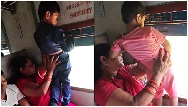 ರೈಲಿನ ಬೋಗಿಯ ಕಿಟಕಿ ಬದಿ ಕುಳಿತ ಗುಲಾಬಿ ಸೀರೆ ಧರಿಸಿದ ಮಹಿಳೆ ಇಬ್ಬರು ಮಕ್ಕಳನ್ನು ಕಿಟಕಿಯಲ್ಲಿ ನಿಲ್ಲಿಸಿ ಮೂತ್ರ ಮಾಡಿಸುವ ವಿಡಿಯೊ ಸೋಷಿಯಲ್ ಮೀಡಿಯಾದಲ್ಲಿ ಸಾಕಷ್ಟು ವೈರಲ್ ಆಗಿದೆ. ಕಿಟಕಿ ಮೇಲೆ ಎಮರ್ಜೆನ್ಸಿ ವಿಂಡೋ ಎಂದು ಗುರುತಿಸಿರುವುದು ಕಾಣುತ್ತದೆ.