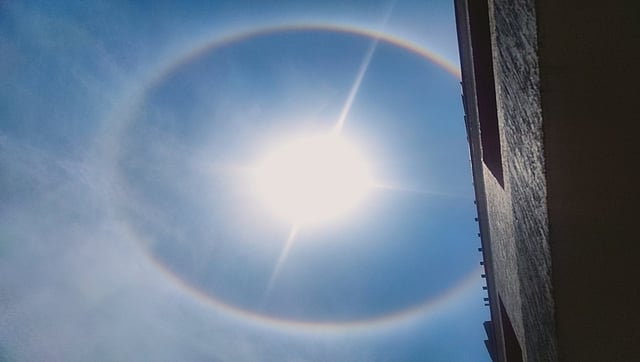 ಸೂರ್ಯನ ಪ್ರಭಾವಲಯ?: ಸೂರ್ಯನ ಸುತ್ತ 22 ಡಿಗ್ರಿಯಲ್ಲಿ ಗೋಳಾಕಾರದಲ್ಲಿ ಕಾಮನಬಿಲ್ಲು ರೂಪದಲ್ಲಿ ಪ್ರಭಾವಳಿ ಕಂಡುಬಂದಿದೆ.
