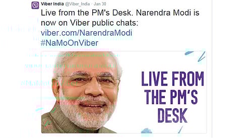 ವೈಬರ್ ಬಳಸಲಾರಂಭಿಸಿದ ಮೋದಿ ಇದರಲ್ಲಿ ಗಣರಾಜ್ಯೋತ್ಸವದ ಪರೇಡ್ ಚಿತ್ರಗಳನ್ನು ಮತ್ತು 1950ಜನವರಿ 26ರಂದು ಬಿಡುಗಡೆಯಾದ ಅಂಚೆಚೀಟಿಯ ಚಿತ್ರವನ್ನು ಶೇರ್ ಮಾಡಿದ್ದಾರೆ.