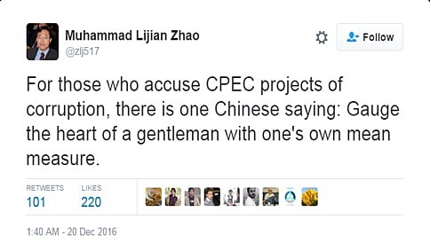 ಪಾಕಿಸ್ತಾನದಲ್ಲಿ ಸಂಪೂರ್ಣ ಬೆಂಬಲ ಹೊಂದಿರುವ ಸಿಪಿಇಸಿ ಯೋಜನೆಗೆ ಕೆಲವು ಜನರಿಂದ ಅಡ್ಡಿ ಉಂಟಾಗುತ್ತಿದೆ ಎಂದು ಚೀನಾ ರಾಯಭಾರಿ ಟ್ವೀಟ್ ಮಾಡಿದ್ದರು. ಅಷ್ಟೇ ಅಲ್ಲದೇ ಕೆಲವರಿಂದ ಯೋಜನೆ ಬಗ್ಗೆ ಭ್ರಷ್ಟಾಚಾರದ ಆರೋಪ ಕೇಳಿಬಂದಿರುವ ಬಗ್ಗೆಯೂ ಅಸಮಾಧಾನ ವ್ಯಕ್ತಪಡಿಸಿ, ಸಿಪಿಇಸಿ ಯೋಜನೆಯ ಬಗ್ಗೆ ಭ್ರಷ್ಟಾಚಾರ ಆರೋಪ ಮಾಡುತ್ತಿರುವವರು, ಓರ್ವ ಸಂಭಾವಿತ ವ್ಯಕ್ತಿಯ ಅಂತರಾಳವನ್ನು ಆತನ ಕ್ರಮಗಳ ಆಧಾರದಲ್ಲಿ ಅಳತೆ ಮಾಡಬೇಕೆಂಬ ಚೀನಾದ ಜನಪ್ರಿಯ ನುಡಿಗಟ್ಟನ್ನು ಅರ್ಥ ಮಾಡಿಕೊಳ್ಳಬೇಕು ಎಂದು ಟ್ವೀಟ್ ಮಾಡಿದ್ದರು.