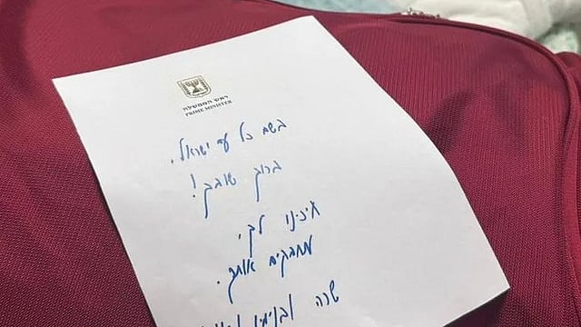 ಒತ್ತೆಯಾಳುಗಳ ವೆಲ್ ಕಮ್ ಕಿಟ್ನಲ್ಲಿ ಬಟ್ಟೆ, ವೈಯಕ್ತಿಕ ಉಪಕರಣಗಳು, ಲ್ಯಾಪ್ಟಾಪ್, ಸೆಲ್ಫೋನ್ ಮತ್ತು ಟ್ಯಾಬ್ಲೆಟ್ ಸೇರಿವೆ. ಇಸ್ರೇಲ್ ಜನರ ಪರವಾಗಿ, ಮರಳಿ ಸ್ವಾಗತ! ನಾವು ನಿಮಗಾಗಿ ಕಾಯುತ್ತಿದ್ದೇವೆ. ನಾವು ನಿಮ್ಮನ್ನು ಅಪ್ಪಿಕೊಳ್ಳುತ್ತೇವೆ ಎಂದು ಸಾರಾ ಮತ್ತು ಬೆಂಜಮಿನ್ ನೆತನ್ಯಾಹು ಅವರ ಕೈಯಲ್ಲಿ ಬರೆದಿದ್ದಾರೆ.
