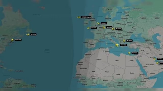 ಜಾಗತಿಕ ನಕ್ಷೆಯೊಂದಿಗೆ ಫ್ಲೈಟ್ ರಾಡಾರ್ ವಿಡಿಯೋ ಓಪನ್ ಆಗುತ್ತದೆ. ಯುಎಸ್ ಮತ್ತು ಮಧ್ಯಪ್ರಾಚ್ಯದಲ್ಲಿ ಜೂಮ್ ಇನ್ ಆಗುತ್ತದೆ. ಫೈಟರ್ ಜೆಟ್ಗಳು, ಇಂಧನ ತುಂಬುವ ಟ್ಯಾಂಕರ್ಗಳು ಮತ್ತು ಯುಎಸ್ ನೆಲೆಗಳನ್ನು ತೊರೆಯುವ ಸಾರಿಗೆ ವಿಮಾನಗಳನ್ನು ಪ್ರತಿನಿಧಿಸುವ ಐಕಾನ್ಗಳನ್ನು ಪರದೆ ಮೇಲೆ ಪ್ರದರ್ಶಿಸುತ್ತದೆ.