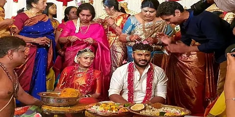 ಬೆಂಗಳೂರು: ನಟ, ನಿರ್ದೇಶಕ, ವಿ ರವಿಚಂದ್ರನ್ ಪುತ್ರ ಮನೋರಂಜನ್- ಸಂಗೀತಾ ವಿವಾಹ ಇಂದು ಅರಮನೆ ಮೈದಾನದಲ್ಲಿ ಅದ್ಧೂರಿಯಾಗಿ ನಡೆಯಿತು.