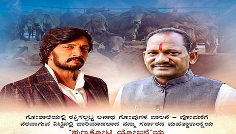 ಬೆಂಗಳೂರು: ರಾಜ್ಯ ಸರ್ಕಾರದ ಮಹತ್ವಾಕಾಂಕ್ಷಿ ಯೋಜನೆಯಾದ ಪುಣ್ಯಕೋಟಿ ಯೋಜನೆಯ ರಾಯಭಾರಿಯಾಗಿ ಕರುನಾಡ ಚಕ್ರವರ್ತಿ ಕಿಚ್ಚ ಸುದೀಪ್ ಅವರನ್ನು ನೇಮಿಸಲಾಗಿದೆ ಎಂದು ಪಶು ಸಂಗೋಪನೆ ಸಚಿವ ಪ್ರಭು ಬಿ.ಚವ್ಹಾಣ್ ತಿಳಿಸಿದ್ದಾರೆ.