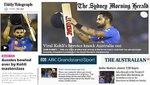 ನವದೆಹಲಿ: ಮೊಹಾಲಿಯಲ್ಲಿ ಭಾನುವಾರ ರಾತ್ರಿ ನಡೆದ ಆಸ್ಟ್ರೇಲಿಯಾ ವಿರುದ್ಧದ ಪಂದ್ಯದಲ್ಲಿ ಅಮೋಘ ಬ್ಯಾಟಿಂಗ್ ಪ್ರದರ್ಶನ ನೀಡಿ ಭಾರತವನ್ನು ಸೆಮೀಸ್ ಗೆ ಕರೆದೊಯ್ದ ವಿರಾಟ್ ಕೊಹ್ಲಿ ಪ್ರದರ್ಶನವನ್ನು ಆಸ್ಟ್ರೇಲಿಯಾದ ಮಾಧ್ಯಮಗಳು ಶ್ಲಾಘಿಸಿ ಲೇಖನಗಳನ್ನು ಪ್ರಕಟಿಸಿವೆ.