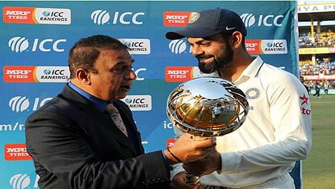 ಇಂಧೋರ್ ನಲ್ಲಿ ನಡೆದ ನ್ಯೂಜಿಲೆಂಡ್ ವಿರುದ್ಧದ ಮೂರನೇ ಟೆಸ್ಟ್ ಪಂದ್ಯ ಗೆದ್ದ ಬಳಿಕ ಪ್ರಶಸ್ತಿ ಪ್ರದಾನ ನಂತರ ಭಾರತದ ಮಾಜಿ ನಾಯಕ ಸುನೀಲ್ ಗವಾಸ್ಕರ್ ನಾಯಕ ವಿರಾಟ್ ಕೊಹ್ಲಿಗೆ ಗದೆ ನೀಡಿ ಗೌರವಿಸಿದರು.
