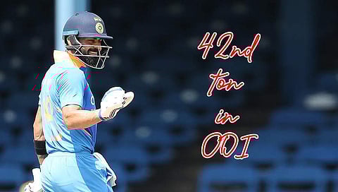 ಹೌದು.. ಇಂದು ಟ್ರಿನಿಡಾಡ್ ನ ಪೋರ್ಟ್ ಆಫ್ ಸ್ಪೇನ್ ನಲ್ಲಿರುವ ಕ್ವೀನ್ಸ್ ಪಾರ್ಕ್ ಓವಲ್ ಮೈದಾನದಲ್ಲಿ ನಡೆಯುತ್ತಿರುವ 2ನೇ ಏಕದಿನ ಪಂದ್ಯದಲ್ಲಿ ನಾಯಕ ವಿರಾಟ್ ಕೊಹ್ಲಿ ಭರ್ಜರಿ ಬ್ಯಾಟಿಂಗ್ ಮೂಲಕ ಮತ್ತೊಂದು ಶತಕ ಸಾಧನೆ ಮಾಡಿದ್ದಾರೆ. 112 ಎಸೆತಗಳಲ್ಲಿ 100 ರನ್ ಗಳಿಸಿದ ಕೊಹ್ಲಿ ಏಕದಿನ ಕ್ರಿಕೆಟ್ ನಲ್ಲಿ ತಮ್ಮ 42ನೇ ಶತಕ ಗಳಿಸಿದರು. ಅಂತೆಯೇ ಈ ಶತಕದ ಮೂಲಕ ಕಿಂಗ್ ಕೊಹ್ಲಿ ಹಲವು ದಾಖಲೆಗಳ ಸರದಾರರಾಗಿದ್ದು, ಕ್ರಿಕೆಟ್ ಲೋಕದ ದಿಗ್ದಜರ ದಾಖಲೆಗಳನ್ನು ಪುಡಿಗಟ್ಟಿದ್ದಾರೆ.