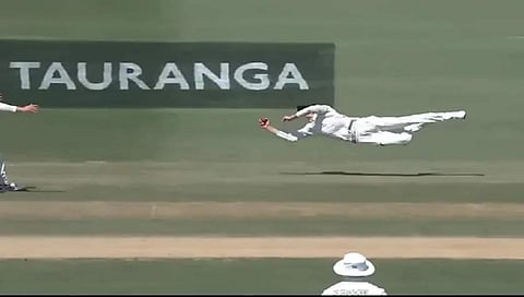 ಮೌಂಟ್ ಮೌಂಗನುಯಿ: ಬೇ ಓವಲ್ ಮೈದಾನದಲ್ಲಿ ಇಂಗ್ಲೆಂಡ್ ವಿರುದ್ಧದ ಮೊದಲ ಟೆಸ್ಟ್ ಪಂದ್ಯದಲ್ಲಿ ನ್ಯೂಜಿಲೆಂಡ್ ತಂಡದ ಮಿಚೆಲ್ ಸ್ಯಾಂಟ್ನರ್ ಅವರ ಸ್ಟನಿಂಗ್ ಕ್ಯಾಚಿಂಗ್ ವಿಡಿಯೋ ಸಾಮಾಜಿಕ ಜಾಲತಾಣಗಳಲ್ಲಿ ವೈರಲ್ ಆಗಿದೆ.