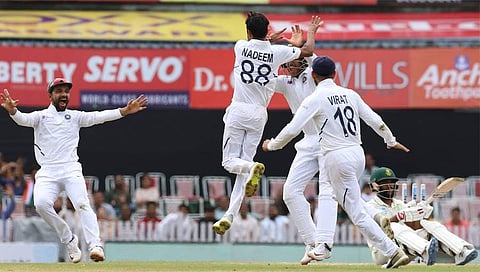 ರಾಂಚಿ ಕ್ರಿಕೆಟ್ ಮೈದಾನದಲ್ಲಿ ನಡೆಯುತ್ತಿರುವ ಮೂರನೇ ಟೆಸ್ಟ್ ಪಂದ್ಯದ 3ನೇ ದಿನದಾಟದಲ್ಲಿ ಮೊದಲ ಇನ್ನಿಂಗ್ಸ್ ನಲ್ಲಿ ದಕ್ಷಿಣ ಆಫ್ರಿಕಾ ಕೇವಲ 130 ರನ್ ಗಳಿಗೆ ವಿಕೆಟ್ ಕಳೆದುಕೊಂಡಿದೆ. ಆಫ್ರಿಕಾ ಪರ ಹಮ್ಜಾ (62 ರನ್) ಮತ್ತು ಭವುಮಾ (32 ರನ್) ಕೊಂಚ ಪ್ರತಿರೋಧ ಒಡ್ಡಿದರಾದರೂ, ಭಾರತೀಯ ಬೌಲರ್ ಗಳ ಸಾಂಘಿಕ ಪ್ರದರ್ಶನಕ್ಕೆ ತತ್ತರಿಸಿ ವಿಕೆಟ್ ಕೈ ಚೆಲ್ಲಿದರು. ಆರಂಭದಿಂದಲೂ ನಿಗದಿತವಾಗಿ ವಿಕೆಟ್ ಕೈ ಚೆಲ್ಲುತ್ತಾ ಸಾಗಿದ್ದ ಆಫ್ರಿಕಾ ತಂಡಕ್ಕೆ ವೇಗಿಗಳಾದ ಮಹಮದ್ ಶಮಿ, ಉಮೇಶ್ ಯಾದವ್ ಆಘಾತ ನೀಡಿದರೆ, ಹಮ್ಜಾ ವಿಕೆಟ್ ಪಡೆಯುವ ಮೂಲಕ ರವೀಂದ್ರ ಆಫ್ರಿಕಾಗೆ ಮರ್ಮಾಘಾತ ನೀಡಿದರು.