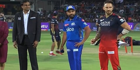 ಬೆಂಗಳೂರು: ಉದ್ಯಾನಗರಿ ಬೆಂಗಳೂರಿನ ಚಿನ್ನಸ್ವಾಮಿ ಕ್ರೀಡಾಂಗಣದಲ್ಲಿ ರಾಯಲ್ಸ್ ಚಾಲೆಂಜರ್ಸ್ ಬೆಂಗಳೂರು ಮತ್ತು ಮುಂಬೈ ಇಂಡಿಯನ್ಸ್ ನಡುವಣ ಐಪಿಎಲ್ ಪಂದ್ಯ ನಡೆಯುತ್ತಿದೆ. ರಾಯಲ್ ಚಾಲೆಂಜರ್ಸ್ ಬೆಂಗಳೂರು ತಂಡದ ನಾಯಕ ಫಾಪ್ ಡ್ಲು ಪ್ಲೆಸಿಸ್ ಟಾಸ್ ಗೆದ್ದು ಮೊದಲಿಗೆ ಫೀಲ್ಡಿಂಗ್ ಆಯ್ಕೆ ಮಾಡಿಕೊಂಡರು. ಈ ಪಂದ್ಯ ಉಭಯ ತಂಡಗಳು ಐಪಿಎಲ್ 2023 ಆವೃತ್ತಿಯ ಮೊದಲ ಪಂದ್ಯವಾಗಿದೆ.