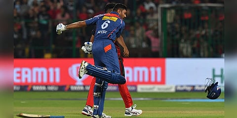 ನಿನ್ನೆ ಚಿನ್ನಸ್ವಾಮಿ ಕ್ರೀಡಾಂಗಣದಲ್ಲಿ ಅಕ್ಷರಃ ರನ್ ಮಳೆಯೇ ಹರಿಯಿತು. ಉಭಯ ತಂಡಗಳು ಸೇರಿ 425 ರನ್ ಪೇರಿಸಿತು. ಡುಪ್ಲೆಸಿಸ್ ಅವರ 115 ಮೀಟರ್ ಸಿಕ್ಸರ್ ಸೇರಿ ಒಟ್ಟು 27 ಸಿಕ್ಸರ್ ಗಳು ಸಿಡಿದವು. ಕೊನೆಯ ಎಸೆತದಲ್ಲಿ ಒಂದು ರನ್ ಬೇಕಿದ್ದಾಗ ಬ್ಯಾಟ್ ಗೆ ಚೆಂಡು ತಾಗದಿದ್ದರೂ ಆವೇಶ್ ಖಾನ್ ಒಂದು ರನ್ ಕದ್ದರು. ಈ ವೇಳೆ ಸಂಭ್ರಮಾಚರಣೆ ಮಾಡಿದ ಆವೇಶ್ ಖಾನ್ ತನ್ನ ಹೆಲ್ಮೆಟ್ ಅನ್ನು ತೆಗೆದು ನೆಲಕ್ಕೆ ಬಿಸಾಡಿದ್ದರು. ಇದೇ ವರ್ತನೆ ಅವರಿಗೆ ಮುಳುವಾಗಿದ್ದು, ಅವರಿಗೆ ವಾಗ್ದಂಡನೆ ವಿಧಿಸಲಾಗಿದೆ.