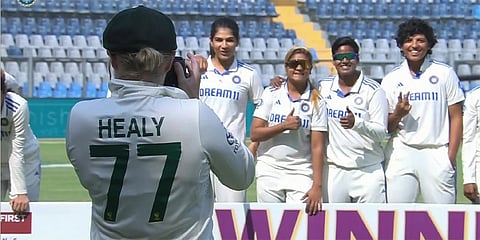 ಆಸ್ಟ್ರೇಲಿಯಾ(AUSW vs INDW) ವಿರುದ್ಧದ ಏಕೈಕ ಪಂದ್ಯದ ಟೆಸ್ಟ್ ಸರಣಿಯನ್ನು 8 ವಿಕೆಟ್ಗಳಿಂದ ಗೆಲ್ಲುವ ಮೂಲಕ ಭಾರತ ಮಹಿಳಾ ಕ್ರಿಕೆಟ್ ತಂಡ ಐತಿಹಾಸಿಕ ಸಾಧನೆ ಮಾಡಿದೆ. ಈ ಗೆಲುವಿನ ಸಂಭ್ರಮದಲ್ಲಿದ್ದಾಗ ಆಸೀಸ್ ನಾಯಕಿ ಅಲಿಸ್ಸಾ ಹೀಲಿ(Australia captain Alyssa Healy) ಅವರು ಅಚ್ಚರಿ ಎಂಬಂತೆ ಕ್ಯಾಮೆರಾ ಹಿಡಿದು ಮೈದಾನಕ್ಕೆ ಬಂದಿದ್ದು, ಟೀಂ ಇಂಡಿಯಾ ಆಟಗಾರ್ತಿಯರ ಫೋಟೊ ಕೂಡ ಕ್ಲಿಕ್ಕಿಸಿದ್ದಾರೆ.