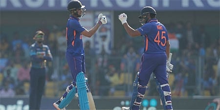 ಗುವಾಹತಿ: ಶ್ರೀಲಂಕಾ ವಿರುದ್ಧ ಮೊದಲ ಏಕದಿನ ಪಂದ್ಯದಲ್ಲಿ ಟಾಸ್ ಸೋತು ಮೊದಲು ಬ್ಯಾಟಿಂಗ್ ಮಾಡುತ್ತಿರುವ ಭಾರತ ತಂಡ ಭರ್ಜರಿ ಆರಂಭ ಪಡೆದಿದ್ದು, ನಾಯಕ ರೋಹಿತ್ ಶರ್ಮಾ ಮತ್ತು ಶುಭ್ ಮನ್ ಗಿಲ್ ಶತಕದ ಜೊತೆಯಾಟ ನೀಡಿದ್ದಾರೆ.