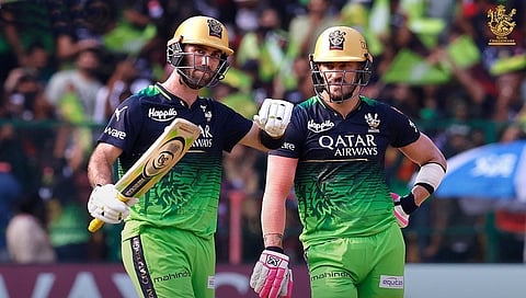 ಆರ್ಸಿಬಿ ಪರ ಆರಂಭಿಕರಾಗಿ ಕಣಕ್ಕಿಳಿಂದ ವಿರಾಟ್ ಕೊಹ್ಲಿ ಮೊದಲ ಎಸೆತದಲ್ಲಿ ಶೂನ್ಯಕ್ಕೆ ಔಟಾಗಿ ಪೆವಿಲಿಯನ್ ಪೇರಿಸಿದರು. ನಂತರ ಬಂದ ಶಹಬಾಜ್ ಅಹ್ಮದ್ ಸಹ ಎರಡು ರನ್ ಗಳಿಸಿ ಔಟಾದರು. ಈ ವೇಳೆ ಜೊತೆಯಾದ ಫಾಫ್ ಡುಪ್ಲೆಸಿಸ್ (62) ಮತ್ತು ಗ್ಲೇನ್ ಮ್ಯಾಕ್ಸ್ ವೆಲ್ (77) ರನ್ ಗಳ ಭರ್ಜರಿ ಬ್ಯಾಟಿಂಗ್ ಮಾಡಿದ್ದು ತಂಡದ ಸ್ಪರ್ಧಾತ್ಮಕ ರನ್ ಕಲೆಹಾಕಲು ಸಾಧ್ಯವಾಯಿತು.