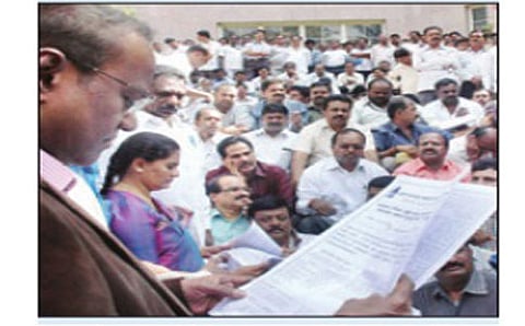 ಬೆಂಗಳೂರು: ಬಿಬಿಎಂಪಿ ಅಧಿಕಾರಿ ಗೋವಿಂದರಾಜು ಹಲ್ಲೆ ಪ್ರಕರಣ ಖಂಡಿಸಿ ಬಿಬಿಎಂಪಿ ನೌಕರರ ಸಂಘ ಮಂಗಳವಾರ ಪ್ರತಿಭಟನೆ ನಡೆಸಿತು. ಎಲ್ಲ ವಲಯ ಹಾಗೂ ವಾರ್ಡ್ ಕಚೇರಿಗಳನ್ನು ಬಂದ್ ಮಾಡಿದ ಬಿಬಿಎಂಪಿಯ 1000ಕ್ಕೂ ಹೆಚ್ಚು ಅಧಿಕಾರಿಗಳು ಸಿಬ್ಬಂದಿ ಕೇಂದ್ರ ಕಚೇರಿಯಲ್ಲಿ ಸಮಾವೇಶಗೊಂಡರು. 4 ತಾಸಿಗೂ ಹೆಚ್ಚು ಕಾಲ ಪ್ರತಿಭಟಿಸಿದರು.