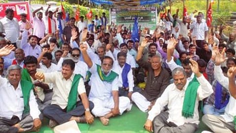 ಪ್ರತಿಭಟನೆ ನೇತೃತ್ವ ವಹಿಸಿದ್ದ ಶಾಸಕ ಕೆ.ಎಸ್.ಪುಟ್ಟಣ್ಣಯ್ಯ ಮಾತನಾಡಿ, `ಕೇಂದ್ರ ಸರ್ಕಾರ ಯಾವುದೇ ಕಾರಣಕ್ಕೂ ಭೂಸ್ವಾಧೀನ ಕಾಯ್ದೆಗೆ ತಿದ್ದುಪಡಿ ತರಬಾರದು. ರೈತ ಪರ ಸಮಗ್ರ ಕೃಷಿ ಹಾಗೂ ಸಾಲದ ನೀತಿ ರೂಪಿಸಿ ಅವರು ಗುಳೆ ಹೋಗುವುದನ್ನು ತಪ್ಪಿಸಬೇಕು. ಅಸಂಘಟಿತ ಕಾರ್ಮಿಕರಿಗೆ ಅನುಕೂಲವಾಗುವಂತೆ ವೇತನ ಆಯೋಗ ಜಾರಿಗೆ ತರಬೇಕು' ಎಂದು ಆಗ್ರಹಿಸಿದರು.
