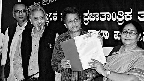 ಪಠ್ಯಪುಸ್ತಕ-ಪಕ್ಷ ಪುಸ್ತಕವಲ್ಲ: 1968ರಲ್ಲಿ ಮತ್ತು 1986ರಲ್ಲಿ ಜಾರಿಗೆ ಬಂದ `ಸಮಾನ ಶಾಲಾ ಶಿಕ್ಷಣ ನೀತಿ'ಯನ್ನು ಯಾವುದೇ ಸರ್ಕಾರಗಳು ಅನುಷ್ಠಾನಕ್ಕೆ ತರದಿರುವುದು ಖಾಸಗೀಕರಣಕ್ಕೆ ಎಡೆಮಾಡಿಕೊಟ್ಟಂತಾಗಿದೆ. ಸರ್ಕಾರಗಳು ಬದಲಾದಂತೆ ಶೈಕ್ಷಣಿಕ ಪಠ್ಯ ಪುಸ್ತಕಗಳನ್ನು ಬದಲಾವಣೆ ಮಾಡುವುದು ಸರಿಯಲ್ಲ. ಪುಠ್ಯಪುಸ್ತಕ ಪಕ್ಷ ಪುಸ್ತಕವಲ್ಲ, ಕೇಸರೀಕರಣಕ್ಕೆ ಸಂವಿಧಾನೀಕರಣ ಮಾಡಬೇಕೆ ವಿನಾ ಕಾಂಗ್ರೆಸ್ಸೀಕರಣ ಪರ್ಯಾಯ ವಲ್ಲ ಎಂದರು.ಇತಿಹಾಸ ತಜ್ಞ ಪ್ರೊ . ಶೆಟ್ಟರ್ ಮಾತನಾಡಿ, ಸಂವಿಧಾನ ಜಾರಿಗೆ ಬಂದಮೇಲೆ ಸಾರ್ವಜನಿಕ ಶಿಕ್ಷಣಕ್ಕೆ ಅರ್ಥ ಬಂತು. ಆದರೆ ಪಠ್ಯಪುಸ್ತಕಗಳ ವೈಜ್ಞಾನಿಕ ಸಂಶೋಧನೆಗೆ ಮೈಸೂರು ಸರ್ಕಾರದಿಂದ ಈ ವರೆಗೂ ಯಾವುದೇ ಸರ್ಕಾರಗಳು ಗ್ರಂಥಾಲಯ ತೆರೆಯದಿರುವುದು ದುರಂತ ಎಂದರು.