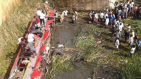 ಪೊಲೀಸರು, ಅಗ್ನಿಶಾಮಕ ಸಿಬ್ಬಂದಿ ರಕ್ಷಣಾ ಕಾರ್ಯಾಚರಣೆ ಕೈಗೊಂಡಿದ್ದು, ಬಸ್ ನಲ್ಲಿ 30ಕ್ಕೂ ಹೆಚ್ಚು ಪ್ರಯಾಣಿಕರಿದ್ದಾರೆಂದು ಶಂಕಿಸಲಾಗಿದೆ. ಸದ್ಯ ಗಾಯಾಳುಗಳನ್ನು ಸ್ಥಳಿಯ ಆಸ್ಪತ್ರೆಗೆ ದಾಖಲಿಸಲಾಗಿದೆ.