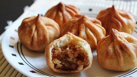 ಹಿಟ್ಟನ್ನು ಮೈದಾದಲ್ಲಿ ಅದ್ದಿ ಚಪಾತಿಯಂತೆ ಲಟ್ಟಿಸಬೇಕು. ಬೇಕಾದ ಗಾತ್ರಕ್ಕೆ ಹಿಟ್ಟನ್ನು ಲಟ್ಟಿಸಬಹುದು. ಬಳಿಕ ತಯಾರಿಸಿಟ್ಟ ಹೂರಣವನ್ನು ಅದರ ಮಧ್ಯದಲ್ಲಿ ಇಟ್ಟು ಕೈಯಲ್ಲೇ ತಿರುಗಿಸುತ್ತಾ ಸರಿಯಾದ ಆಕಾರಕ್ಕೆ ತರಬೇಕು. ಬಳಿಕ ಕುದಿಯುವ ಎಣ್ಣೆಗೆ ಅದನ್ನು ಹಾಕಿ ಸರಿಯಾಗಿ ಬೆಂದ ಬಳಿಕ ಎಣ್ಣೆಯಿಂದ ತೆಗೆಯಬೇಕು. ಮೋದಕ ಸಿದ್ಧ.