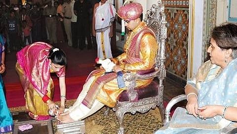 ಮೈಸೂರು: 400 ವರ್ಷಗಳಿಂದ ನಡೆದು ಕೊಂಡು ಬಂದಿರುವ ಮೈಸೂರು ಮನೆತನದ ಖಾಸಗಿ ದರ್ಬಾರ್ ಅನ್ನು ಯದುವೀರ್ ಕೃಷ್ಣದತ್ತ ಚಾಮರಾಜ ಒಡೆಯರ್ ಮುಂದುವರಿಸಿದ್ದಾರೆ. ಅದರಂತೆ ದಸರಾ ಅಂಗವಾಗಿ ಶನಿವಾರ ಮೈಸೂರಿನ ಅಂಬ ವಿಲಾಸ ಅರಮನೆಯಲ್ಲಿ ಖಾಸಗಿ ದರ್ಬಾರ್ ಆರಂಭಿಸಿದ್ದಾರೆ.