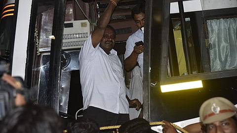 ಬೆಂಗಳೂರು: ಇಡೀ ಕರ್ನಾಟಕ ಜನತೆಯ ಕುತೂಹಲದ ಕೇಂದ್ರವಾಗಿರುವ ಬೆಂಗಳೂರಿನ ಶಕ್ತಿಕೇಂದ್ರ ವಿಧಾನಸೌಧದ ಸದನದಲ್ಲಿ ಇಂದು ವಿಧಾನಸಭಾಧ್ಯಕ್ಷರ ಸಮ್ಮುಖದಲ್ಲಿ ವಿಶ್ವಾಸಮತ ಯಾಚನೆ ಸಂದರ್ಭದಲ್ಲಿ. ಈ ಸಂದರ್ಭದಲ್ಲಿ ಹೈದರಾಬಾದ್ ನ ಹೊಟೇಲ್ ಗೆ ಕರೆದೊಯ್ಯಲಾಗಿದ್ದ ಜೆಡಿಎಸ್ ಮತ್ತು ಕಾಂಗ್ರೆಸ್ ಶಾಸಕರು ಮಧ್ಯರಾತ್ರಿ ಬೆಂಗಳೂರಿಗೆ 4 ಬಸ್ಸುಗಳಲ್ಲಿ ವಾಪಸ್ಸಾಗುತ್ತಿದ್ದಾರೆ. ಇನ್ನು ಕೆಲವೇ ಸಮಯದಲ್ಲಿ ಬೆಂಗಳೂರಿಗೆ ತಲುಪಲಿದ್ದಾರೆ.