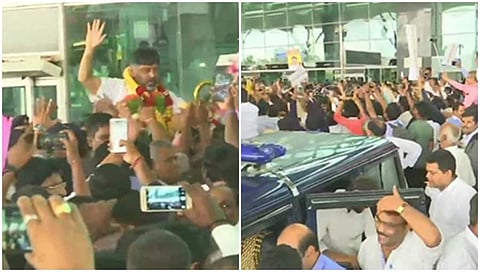 ಡಿಕೆ ಶಿವಕುಮಾರ್ ಸ್ವಾಗತಿಸುವುದಕ್ಕಾಗಿ ಸಹಸ್ರಾರು ಸಂಖ್ಯೆಯ ಕಾಂಗ್ರೆಸ್ ಪಕ್ಷದ ಕಾರ್ಯಕರ್ತರು, ಅಭಿಮಾನಿಗಳು ವಿಮಾನ ನಿಲ್ದಾಣದಲ್ಲಿ ಜಮಾಯಿಸಿದ್ದರು.ಡಿಕೆ ಶಿವಕುಮಾರ್ ನೋಡುತ್ತಿದ್ದಂತೆವಿಮಾನ ನಿಲ್ದಾಣದ ದ್ವಾರದಲ್ಲಿಯೇ ಹೂವಿನ ಸುರಿಮಳೆಗೈದ ಕಾರ್ಯಕರ್ತರು, ಭಾರೀ ಹರ್ಷೋದ್ಗಾರ, ಜೈಕಾರದೊಂದಿಗೆ, ಹೆಗಲ ಮೇಲೆ ಹೊತ್ತು ಸಂಭ್ರಮಿಸಿದರು.