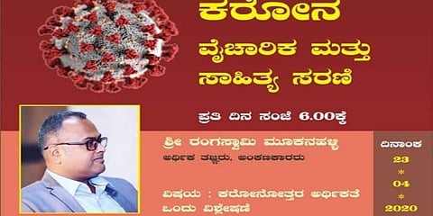 ವೆಬ್ ಎಕ್ಸ್ ಮೂಲಕ ಈ ವೈಚಾರಿಕ ಮತ್ತು ಸಾಹಿತ್ಯ ಸರಣಿ ನಡೆಯುತ್ತಿದ್ದು ಕೊರೋನೋತ್ತರ ಆರ್ಥಿಕತೆ ಕುರಿತು ಸಂಜೆ 6-7 ವರೆಗೆ ತಜ್ಞರು ಮಾತನಾಡಲಿದ್ದಾರೆ. ಆಸಕ್ತರು ಈ ಲಿಂಕ್ ನ್ನು ಕ್ಲಿಕ್ಕಿಸಿ ಕಾರ್ಯಕ್ರಮದಲ್ಲಿ ಸೇರಿಕೊಳ್ಳಬಹುದಾಗಿದೆ.