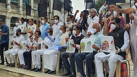 ಆದರೆ ಕಾಂಗ್ರೆಸ್ ಕೃಷಿ ಮಸೂದೆಯನ್ನು ವಿರೋಧಿಸಿದ್ದು, ರಾಜ್ಯ ಕಾಂಗ್ರೆಸ್ ನಾಯಕರು ವಿಧಾನಸೌಧ ಮುಂದೆ ಇಂದು ಪ್ರತಿಭಟನೆ ನಡೆಸಿದರು. ರೈತರಿಗೆ ಮಾರಕವಾದ ಕೃಷಿ ಕಾಯ್ದೆಗಳನ್ನು ಜಾರಿಗೆ ತರಲು ಹೊರಟಿರುವ ಕೇಂದ್ರ ಹಾಗೂ ರಾಜ್ಯ ಬಿಜೆಪಿ ಸರ್ಕಾರದ ವಿರುದ್ಧ ಕಾಂಗ್ರೆಸ್ ಪಕ್ಷದ ಶಾಸಕರು, ಮುಖಂಡರು ಇಂದು ವಿಧಾನಸೌಧ ಆವರಣದಲ್ಲಿನ ಮಹಾತ್ಮ ಗಾಂಧಿ ಪ್ರತಿಮೆ ಮುಂಭಾಗ ಪ್ರತಿಭಟನೆ ನಡೆಸಿದರು.