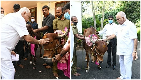 ಬೆಂಗಳೂರು: ಮುಖ್ಯಮಂತ್ರಿ ಬಿ ಎಸ್ ಯಡಿಯೂರಪ್ಪ ಬೆಂಗಳೂರಿನ ತಮ್ಮ ಅಧಿಕೃತ ನಿವಾಸ ಕಾವೇರಿಯಲ್ಲಿ ಶುಕ್ರವಾರ ಗೋವುಗಳಿಗೆ ಪೂಜೆ ನೆರವೇರಿಸಿದರು.