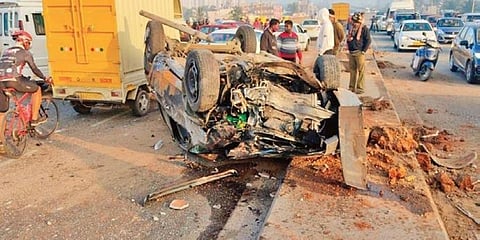 ಬೆಂಗಳೂರು ಕಡೆಗೆ ವೇಗವಾಗಿ ಬಂದ ಕಾರೊಂದು, ನಿಯಂತ್ರಣ ಕಳೆದುಕೊಂಡಿದ್ದರಿಂದ ವಿಭಜಕ ಹಾರಿ, ಎದುರು ಮಾರ್ಗದಲ್ಲಿ ಬಂದ ಕಾರಿಗೆ ಡಿಕ್ಕಿ ಹೊಡೆದಿದೆ. ಬಳಿಕ ಹಿಂಬದಿಯಲ್ಲಿ ಬರುತ್ತಿದ್ದ ಮೂರು ಕಾರುಗಳು ಒಂದಕ್ಕೊಂದು ಡಿಕ್ಕಿ ಹೊಡೆದಿವೆ.