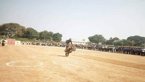 ಗಂಗಾವತಿ: ಆನೆಗೊಂದಿಯಲ್ಲಿ ಜ.9 ಮತ್ತು 10ರಂದು ನಡೆಯಲಿರುವ ಉತ್ಸವ-20ರ ಅಂಗವಾಗಿ ಶುಕ್ರವಾರ ಇಲ್ಲಿನ ತಾಲ್ಲೂಕು ಕ್ರೀಡಾಂಗಣದಲ್ಲಿ ನಡೆದ ಯುವಕರ ಬೈಕ್ ಸ್ಟಂಟ್ ನೆರೆದವರ ಮೇನೆವರೇಳುವಂತೆ ಮಾಡಿತ್ತು