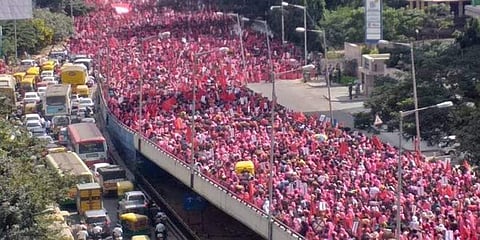 ಭಾರೀ ಪ್ರತಿಭಟನಾ ಮೆರವಣಿಗೆಯಿಂದ ಮೆಜೆಸ್ಟಿಕ್ ಸುತ್ತಮುತ್ತ ವಾಹನ ಸಂಚಾರಕ್ಕೆ ತೀವ್ರ ಅಡಚಣೆಯುಂಟಾಗಿತ್ತು.