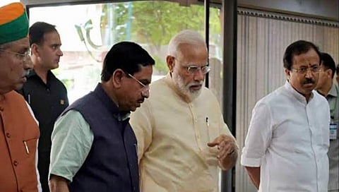 ಬೆಂಗಳೂರು: 2 ದಿನಗಳ ಕಾಲ ರಾಜ್ಯದ ಪ್ರವಾಸದಲ್ಲಿರುವ ಪ್ರಧಾನಮಂತ್ರಿ ನರೇಂದ್ರ ಮೋದಿಯವರು, ಗುರುವಾರ ಕಲ್ಪತರು ನಾಡಲ್ಲಿ ರೈತರಿಗೆ ಆತ್ಮಸ್ಥೈರ್ಯ ತುಂಬಿದರು. ಈ ವೇಳೆ ತಮ್ಮ ಭಾಷಣವನ್ನು ಅನುವಾದ ಮಾಡುವ ಜವಾಬ್ದಾರಿಯನ್ನು ಕೇಂದ್ರ ಸಂಸದೀಯ ವ್ಯವಹಾರಗಳ ಸಚಿವ ಪ್ರಹ್ಲಾದ್ ಜೋಷಿಯವರಿಗೆ ನೀಡಿದ್ದರು. ಅನುವಾದ ಮಾಡಲು ಜೋಷಿಯವರಿಗೆ ಧೈರ್ಯ ನೀಡಿದ್ದಾರೆ.